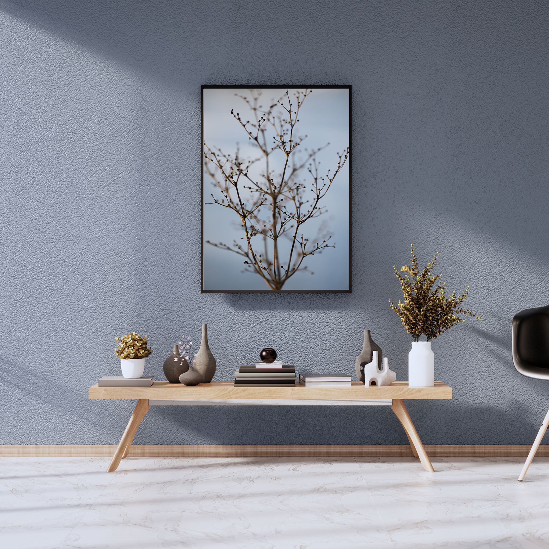 Õrnade okste ja tillukeste pungade rütm loob rahuliku, tasakaalustatud mustri, mis toob ruumi õhku, valgust ja hingamisruumi.