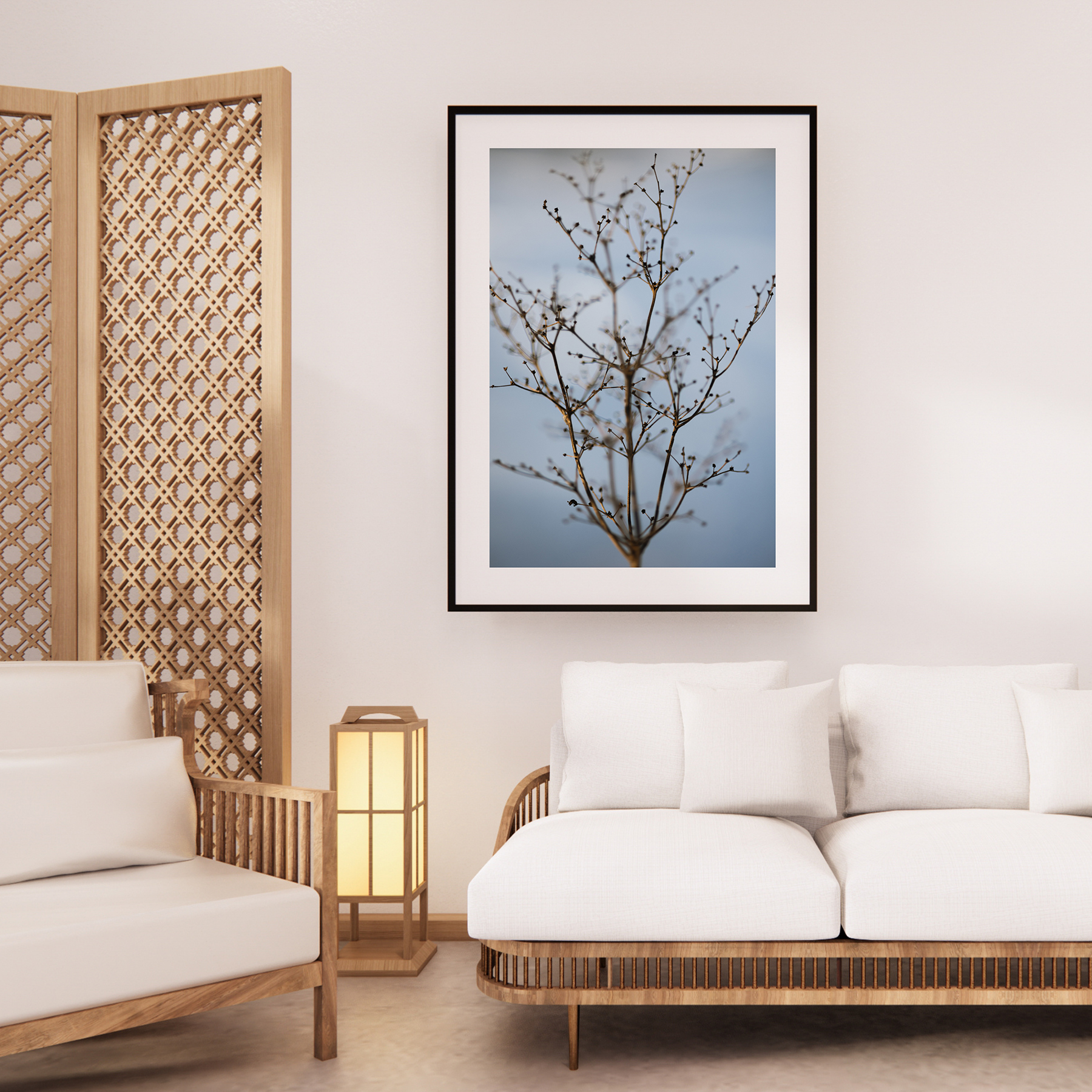Pehme fookus ja vaoshoitud värvipalett muudavad pildi ajatuteks — see ei suru end esile, vaid toetab ruumi, kuhu ta asetatakse. Sobib eriti hästi skandinaavialikku, looduslähedasse ja minimalistlikku interjööri, magamistuppa, elutuppa või rahulikku tööruumi.